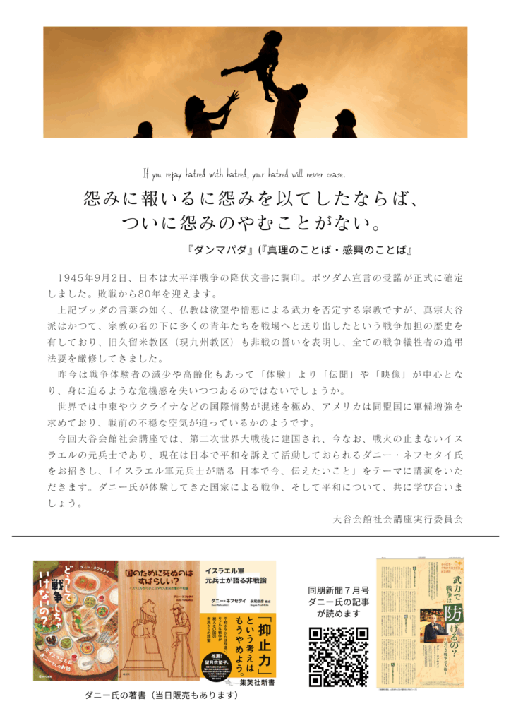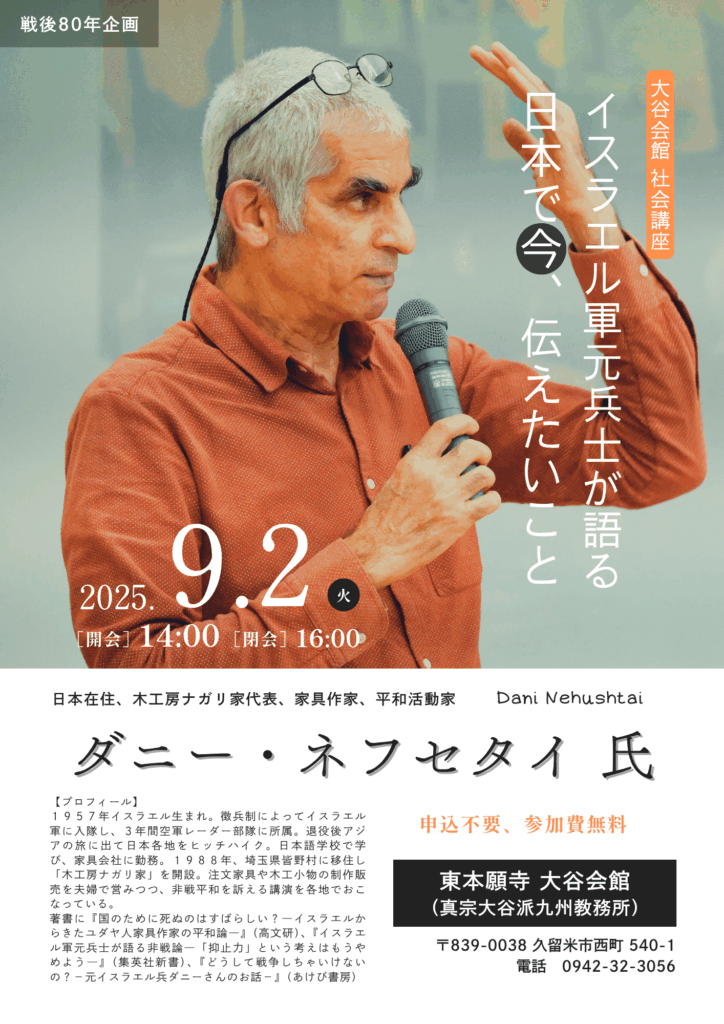 携わっている講演会のご案内です。イスラエル軍元兵士で、日本在住のダニー・ネフセタイ氏の講演会が2025年9月2日14時から、久留米市西町540-1の大谷会館で開催されます。