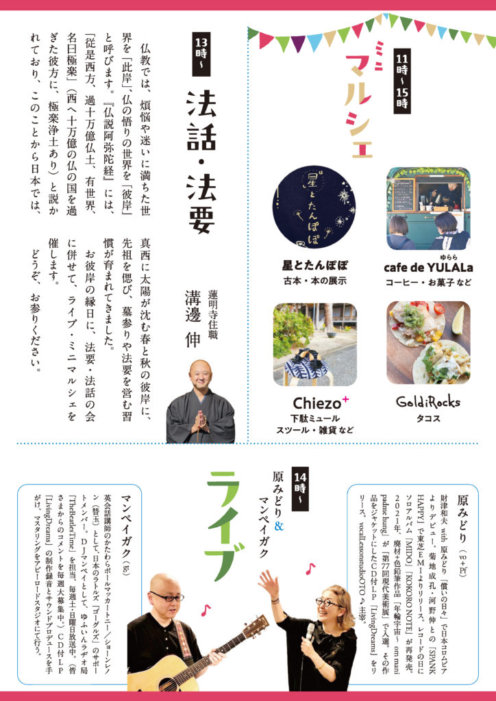 3月22日(日)、春の彼岸法要をお勤めします。法要の縁日として、ライブ&ミニマルシェの縁日を企画しました。